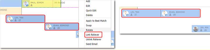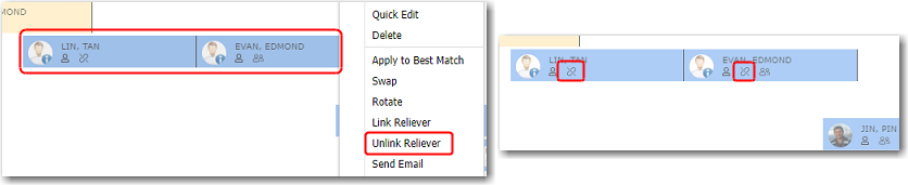 Link and unlink Relievers To link a reliever to a crew member, select the crew member who will be signing off, hold down the ‘Ctrl’ key on your keyboard and then select his replacement. Right-click and select ‘Link Reliever’ from the menu. To unlink relievers, select the crew member who is linked to a replacement, hold down the ‘Ctrl’ key on your keyboard and then select his current replacement. Right-click and select ‘Unlink Reliever’ from the menu. The Unlink icon will be displayed to indicate that they have been successfully unlinked.