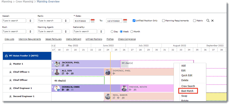 Smart Proposal You can also use the Smart Proposal button to fill in any Unfilled Reliever boxes for any rank in the vessel. 1. On the Planning Overview screen, select the Date From and To period, the Vessel and the Rank for which the Unfilled Reliever box that you want to fill, and right-click and select Best Match to open the Best Match screen. Note: You can also select the Unfilled Positions Only check box to only display vacant positions. This is to make it easier for you to plan and assign crew for unfilled positions. 2. Then, click the Smart Proposal icon. The system will automatically fill in any Unfilled Reliever boxes for that rank in the selected period.