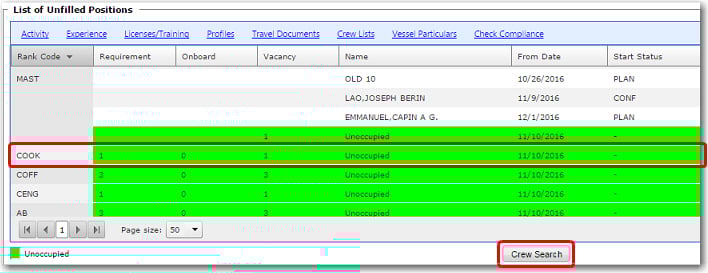 This feature allows you to view vacant positions onboard a vessel and to search for available crew to fill this vacancy.
