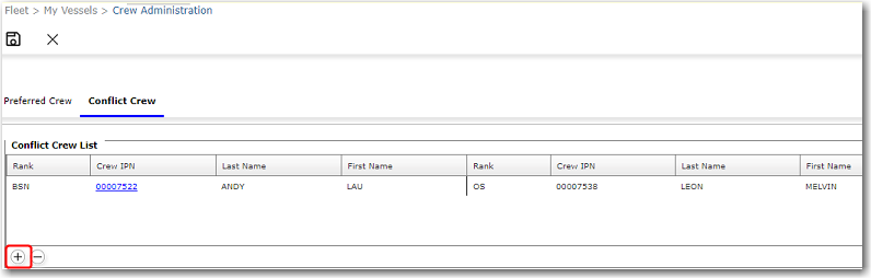 To create a Conflict Crew List: 1. From the HR Manager main menu, click Crew Administration under the Fleet menu. The Crew Administration screen is displayed. 2. Open the Conflict Crew tab. 3. In the Conflict Crew List section, click the + icon to add 2 crews that are in conflict to the list, and - icon to remove the crew members from the list. 4. Click Save to save the changes.