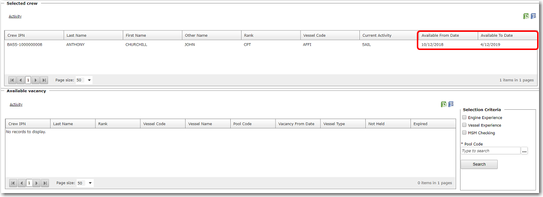 Note: The Include check box enables you to include/omit a criteria for the search without having to remove it from the list of criteria you have selected. This would be handy when running multiple searches one after another. Note: If 'Match All' is selected when defining your search filters, the System will only display records that match all search criteria entered. 3. Click Search. 4. The System will run a search based on the search criteria you have entered. The results of the search will be displayed in the bottom half of the screen. Highlight a crew under the search results and click the Propose Vacancy link. Here you can propose a vacancy for the selected crew member who is currently available or is about to be available to fill a position. 5. The Propose Vacancy screen will be displayed. The previously selected crew record will be automatically displayed on this screen. The Available From and Available To dates indicate the duration during which the crew member is available to fill a position. 6. You can carry out a search for upcoming vacancies using the Selection Criteria section. Filter your search based on Engine Experience, Vessel Experience, MSM Checking and Pool Code. The Pool Code field allows you to select the vessel pool within which the search will be carried out. Select the appropriate check box to use this filter and use the Lookup function to select the relevant Pool code. 7. Click Search. A list of available vacancies will be displayed. The Vacancy From Date column displays the date when the position will become vacant. 8. Select a crew record in the Selected Crew table and then select a record in the Available Vacancy table. This indicates that you want to plan that the crew member selected in the first table will take over the position selected in the second table when it becomes available. 9. After selecting the record, click Activity. 10. The Activity screen for the crew member selected in the Selected Crew table will be displayed. Note that all the details of the upcoming vacancy will be automatically displayed in the crew member's Activity screen. Make any modifications as required and then save the Activity to create it. 11. Repeat the steps above for the remaining crew records in the Selected Crew table of the Propose Vacancy screen.