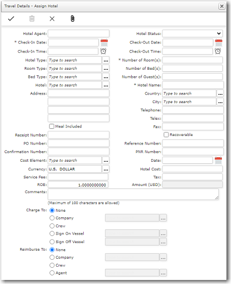 18. Click OK once done. The Total Other Cost field will display the total cost of additional travel costs incurred. Note: You can click the '+' icon to add more travel cost details to the table. 19. The Travel Documents tab displays the travel documents currently held by this crew member. This allows you to quickly view the validity of the documents. 20. The Attachment tab allows you to attach relevant documents to this record. In the Document(s) Attached field, click the Lookup function to open the Upload Manager and then select and upload all relevant documents. By clicking the email icons next to the Travel Agent, Port Agent, Vessel and Manning Agent fields, you are able to send the confirmed travel details to the travel agent, port agent, vessel and/or manning agent. Valid email address must have been added for these entities in the Registers sub module. The Last Sent fields display the date when the emails were sent. 21. If the cost of the travel is to be charged to the crew member, then in the Charge to Crew IPN field, use the Lookup function to select the IPN of the crew member to whom the charge should be levied. 22. The Total Travel Cost field displays total travel cost which includes all items added in the Flight, Hotel, Transport, Invoice and Other tabs. 23. Click Save at the top of the screen to save the information entered in this record.