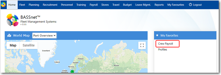 To add a screen to the My Favourites menu: 1. Open a screen that you wish to add to the My Favourites menu. In this example, we will add the Crew Payroll screen to My Favorites. Click Crew Payroll under the Payroll module. 2. The Crew Payroll screen is displayed. From the My Favourites menu, select Add to My Favourites. 3. The Crew Payroll page will now be available for easy access under the My Favourites menu and the My Favorites panel on the main HRM screen. 4. To access your favourite screens, click My Favourites on the menu bar or via the My Favorites panel on the main HRM screen.