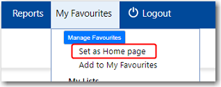 To set a screen as Home page: 1. Open a screen that you wish to use as the Home page. 2. From the My Favourites menu, select Set as Home page. The page will now be displayed as the first screen you see when you log into BASSnet HR Manager. Note: To revert the Home page back to the original HRM Main Page, open the Home menu and select Main Page. Then repeat the steps above to set it as Home page. |