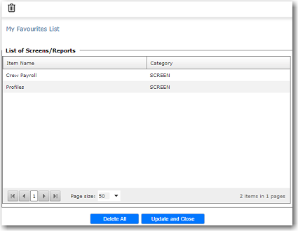 To manage links added to the My Favourites menu: 1. Open the My Favourites menu on the menu bar. 2. The pages that you have added for quick access will be displayed. Click Manage Favourites. 3. The My Favourites List pop-up window will be displayed. 4. Here, you can select an Item Name and click the Delete icon to remove it from your My Favourites List. Note: You can click the Delete All button to delete all items in one-go. 5. Click Update and Close. The item or screen will no longer be displayed under the My Favourites menu.
