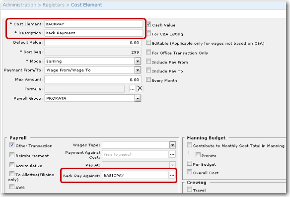 This feature allows you to recalculate the wages of all crew members who have salary changes in their CBA to include the back payment owed to him in the next account period. This feature is convenient in instances where a crew member is owed back payment from a previous account period (for example, if the crew member had a salary increment that is to be back paid for the previous two months. Note that this change in salary should be indicated in his CBA).