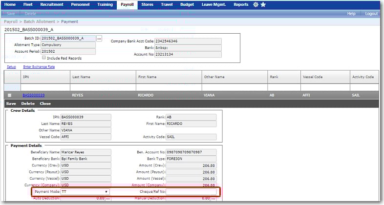 10. Click Save. The entered exchanged rates will now be displayed in the table. You can continue adding all the required exchange rates. Note: To remove an exchange rate from the table, highlight it and click the '-' icon OR click on the exchange rate record and click Delete on the Exchange Rate Details window. 11. Click Save at the top of the screen once done. Then click the Payment link to display the Batch Allotment - Payment screen. 12. On the Batch Allotment - Payment screen, select the Batch ID to populate the other fields and table. Select the Include Paid Records check box to include payroll records that have been paid in the search results. Click on an IPN of a particular crew member in the table to view the crew member's Crew Details and Payment Details. In the Payment Details section, select a Payment Mode and enter the cheque or reference number of the payment in the Cheque/Ref No field. Click Save. 13. Then select the check boxes of the records for which you want to complete payment. Click Save. Note: Under the Miscellaneous tab on the Compulsory/Voluntary Allotment window, the Payment Date field will display the date the allotment payment was made and the Cheque No. field will display the cheque or reference number of the payment.
