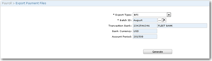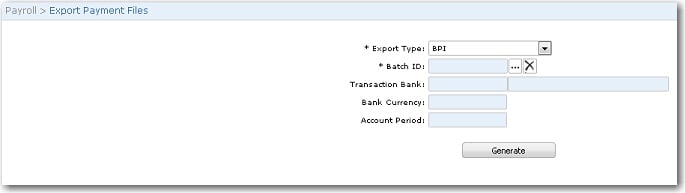 To generate an export payment file: 1. From the HR Manager main menu, click Export Payment File under the Payroll menu. The Export Payment Files screen is displayed. 2. Select an Export Type. The fields available on the screen will be based on your selection. For the purpose of this lesson, we shall select the 'BPI' export type. 3. Use the Lookup function to select a Batch ID as set up on the Batch Allotment screen. The other fields will be populated based on your selection. 4. Click Generate. The files will be generated as '.csv' and Microsoft Excel files.