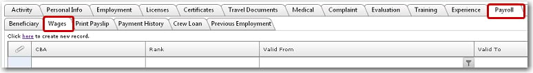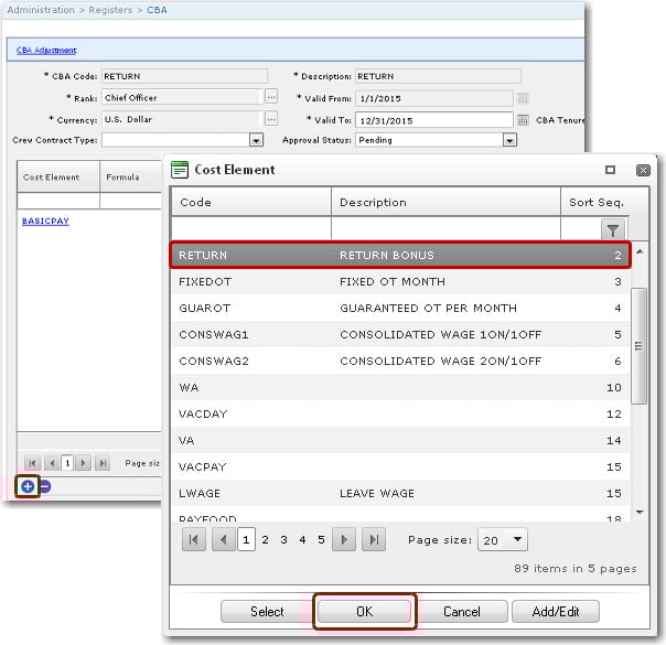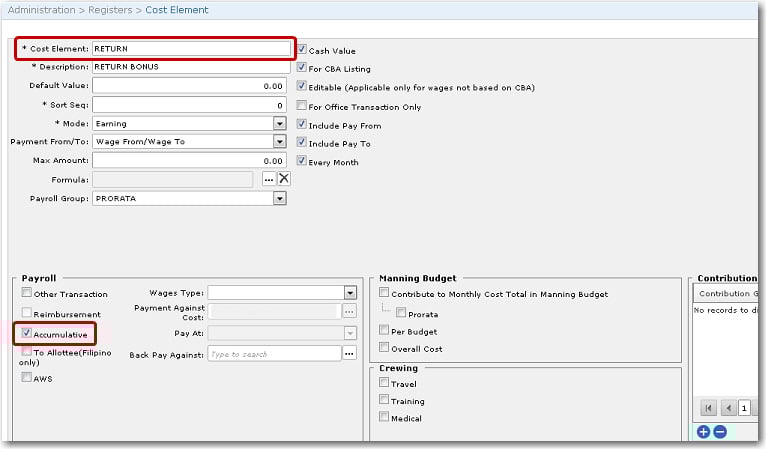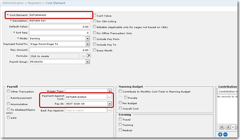 4. Next, assign this cost element to a CBA. From the HR Manager main menu, click Registers under the Home - Administration sub menu. Then, click General, followed by CBA. 5. The CBA codes that have been previously created will be displayed. Click on the CBA code to which you want to assign this 'RETURN' cost element. 6. The CBA screen will be displayed. Click the '+' icon at the bottom left of the table to add a cost element. In the Cost Element pop-up window, select the 'RETURN' cost element that you just created. 7. Click OK to add the 'RETURN' cost element to the table. Then click Save at the top of the screen to save the entry. 8. Next, you will need to assign this CBA to a crew member's wage record. From the HR Manager main menu, click Profiles under the Personnel menu. Ensure that the crew profile to which you want to add wage details has been loaded. Use the Personnel search field to search and select the relevant crew profile OR click the search icon in the search field to use the Personnel List feature on the Simple Search window to select a crew member from a previously saved list of crew members. 9. After you have loaded the crew profile record, click the Wages sub tab under the Payroll tab. 10. Click the 'Click here to create new record' link to create a new wage record. Use the Lookup function in the CBA field to select the CBA scheme to which you previously assigned the 'RETURN' cost element. The table under the Wage Details tab will then be automatically populated with the cost elements attached to the CBA selected. Ensure that the 'RETURN' cost element is included; otherwise, click the '+' icon at the bottom left of the table to add it. Enter any other required details. 11. Click Save. 12. Now create a 'SAIL' activity for the crew member to whom you assigned the CBA previously. 13. The System will automatically include this Return Bonus in the crew member’s wages on the Payroll Summary screen. 14. This Return Bonus will be accumulated and will be paid upon next sign on. When you create another new activity for the crew member, the Return Bonus will be brought over from the previous activity. This will be reflected on the Crew Opening Balance screen. 15. In the Payroll Summary for the crew member, the Return Paid will be reflected to indicate the amount that will actually be paid to the crew member.