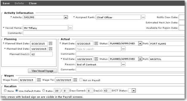You can then assign the Return Bonus cost element to a crew member’s wage. When you then create an activity for this crew member, the System will automatically include the Return Bonus in the crew member’s wages.