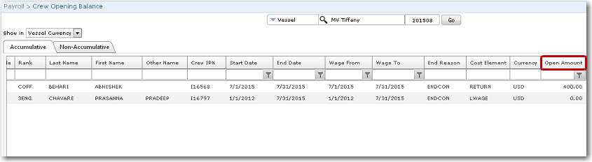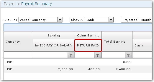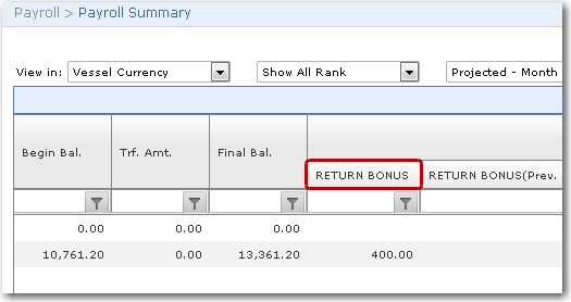 The Return Bonus cost element that is set as Accumulative tracks the accumulated bonus amount over the months while the Return Bonus Paid cost element tracks the actual payment that will be paid out to the crew member upon sign on for his next activity.