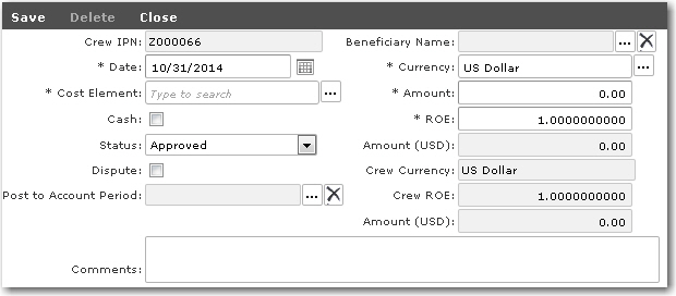 Here you can enter all crew-related deductions for an account period. These deductions are categorized as Bonded Stores, Cash, Travel, Communication and Other Deductions.