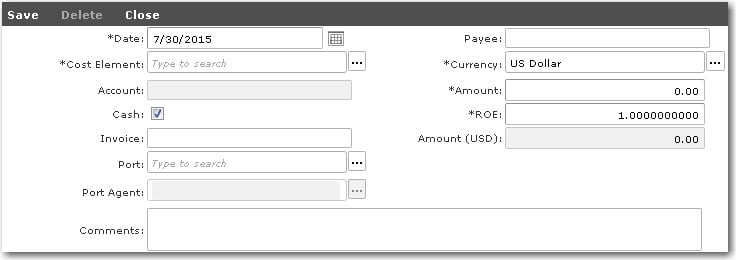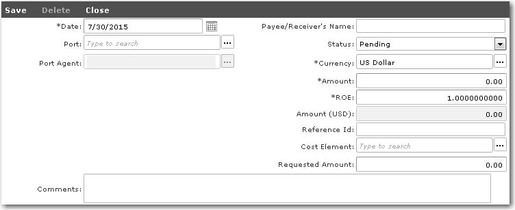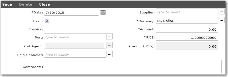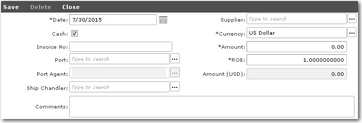 5. Click Save. The information you have entered will now be reflected in the table on the Vessel Cash window, as well as in the Receipt (Vessel Cash) column for Vessel Cash on the Manage Ships Account screen. Note: To remove a record from the table on the Vessel Cash window, highlight a record and then click the '-' icon.
