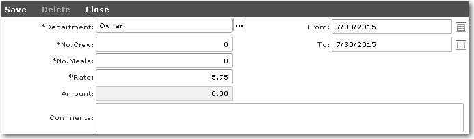 5. Click Save. The information you have entered will now be reflected in the table under the Purchase tab, as well as in the Payment column for Provisions on the Manage Ships Account screen. Note: To remove a record from the table, highlight a record and then click the '-' icon. 6. To add consumption details, click the Consumption tab. Click the '+' icon at the bottom left of the table. Data entry will be enabled where you can enter information in the following fields: