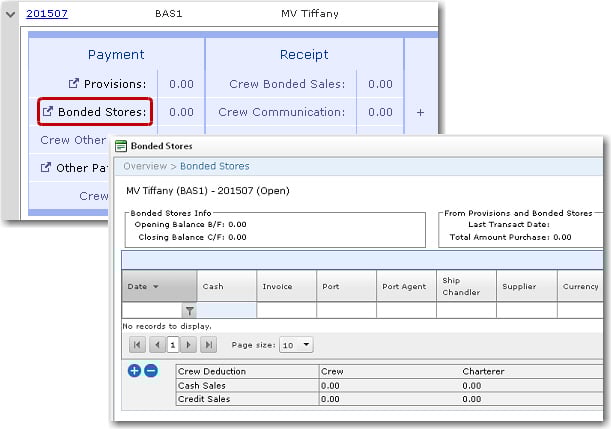 5. Click Save. The information you have entered will now be reflected in the table on the Bonded Stores window, as well as in the Payment column for Bonded Stores on the Manage Ships Account screen. Note: To remove a record from the table on the Bonded Stores window, highlight a record and then click the '-' icon.