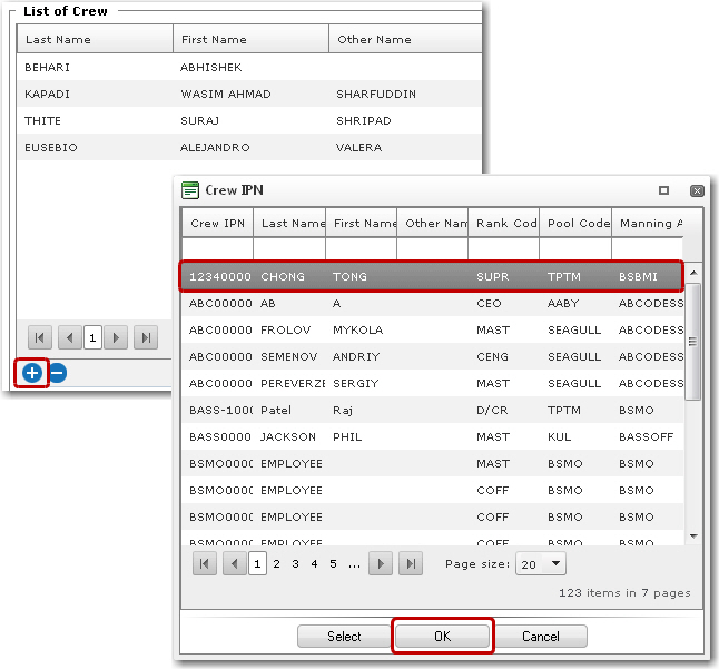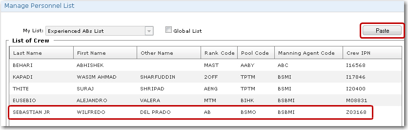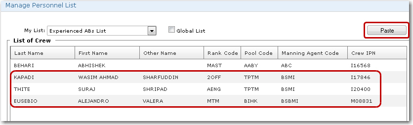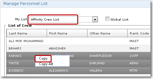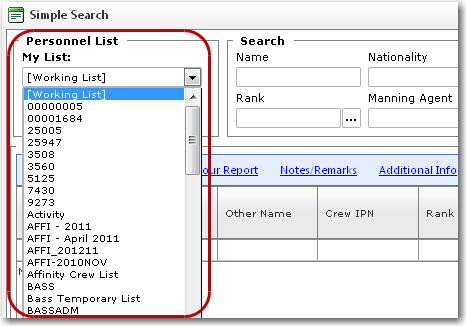 To create a personnel list: 1. On any screen that has the Personnel/Crew search field, click the search icon to display the Simple Search window and carry out a search for crew that you would like to add to a list. The results of the search will be displayed in the Search Results section. 2. Select a crew record. Then right-click on the record and select Create New List from the menu that is displayed. 3. The Manage Personnel List window is displayed. 4. In the List Name field, enter a name for this new list. 5. Click Save. Note that the selected crew will already be listed in the List of Crew table here. 6. You can add more crew records to your list either by: a. Clicking the '+' icon at the bottom left of the List of Crew table on the Manage Personnel List window. The Crew IPN pop-up window will be displayed. Make your selections and click OK. The selected crew records will then be added to the list. b. Loading other lists from the My List drop down menu and then highlighting multiple records from that list. Upon selection, right-click and then select Copy from the menu that is displayed. Next, from the My List drop down menu, select the list to which you would like to add these records. Once the list is displayed, click the Paste button. The previously copied crew records will now be displayed in this list. Important Note: Please click Save in order to save the list. c. Carrying out a search on the Simple Search window. Right-click on a crew record and select Add To Existing List from the menu. On the Manage Personnel List window, select the list to which the selected crew record is to be added (from the My List field) and click select the Paste button. The previously selected crew record will then be added to this list. Note: You can easily access the Manage Personnel List/Manage Vessel List window from the My Favourites menu.