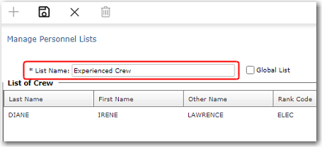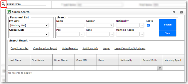 To retrieve records using a personnel list: 1. On any screen that has the Personnel search field, click the search icon to display the Simple Search window. 2. In the Personnel List section, select the list that you want to load. 3. The crew records previously added to this list will then be displayed in the Search Result section. To switch to a different list, make your selection from the Personnel List drop down menu again.