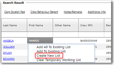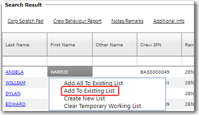 Temporary Working List - you can add records to a temporary list. This allows you to access the records you want to work on currently, very quickly. To add records to the temporary working list, under the Search Results section, right-click on a crew record and select Add to Temporary Working List. Once you are done working on all the records in your temporary list, under the Search Results section, right-click on a crew record and then select Clear Temporary Working List. It is good practice to clear your working list once you are done.