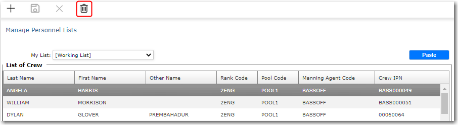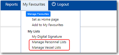 To delete a personnel list: 1. From the Manage Personnel List window, load a list by making your selection from the My List drop down list. The crew records available in this list will be displayed. Note: You can easily access the Manage Personnel List/Manage Vessel List window from the My Favourites menu. 2. Click Delete. The crew list will be deleted and will no longer be available for selection. Important Note: Clicking Delete only removes this personnel list and all crew records that have been categorized under it. It does not delete the crew records in this list from the System.