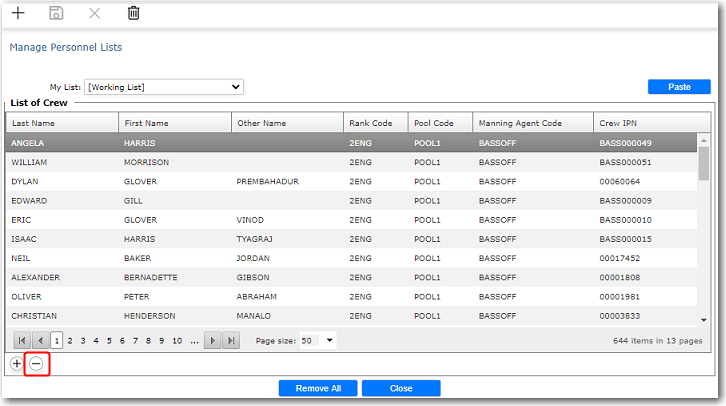 To remove records from a personnel list: 1. From the Manage Personnel List window, load a list by making your selection from the My List drop down list. The crew records available in this list will be displayed. Note: You can easily access the Manage Personnel List/Manage Vessel List window from the My Favourites menu. 2. Highlight the crew record that you want to remove from this list and click the '-' icon. Note: Click the Remove All button to remove all crew records from the list. 3. The crew record will no longer be available in this list. Click Save. Important Note: Clicking Delete only removes this crew record from this personnel list. It does not delete the crew record from the System.