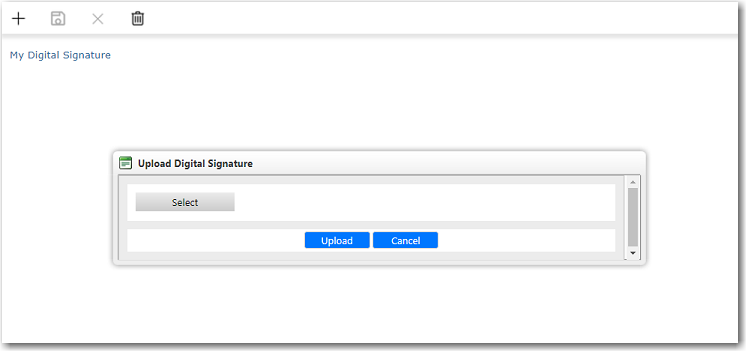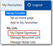 To upload a digital signature: 1. Access the Manage Digital Signature window from the My Favourites menu. 2. Click + to upload a digital signature. 3. Click Select to browse and select an image file of the digital signature. 4. Then click Upload. 5. To add the digital signature to a Crew List report, select the Include Digital Signature check box on the Reports - Crew List screen before generating the report.